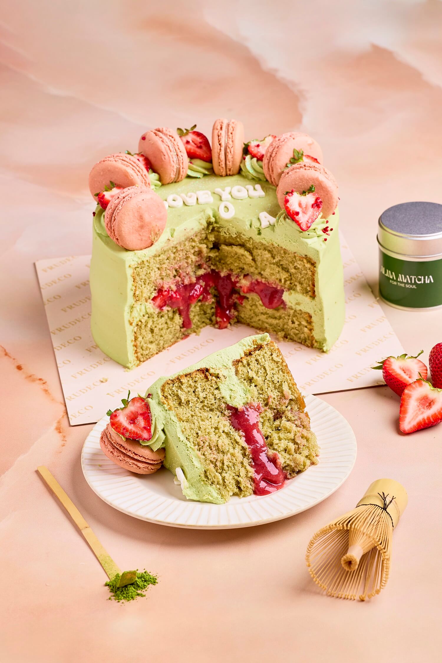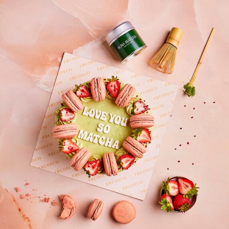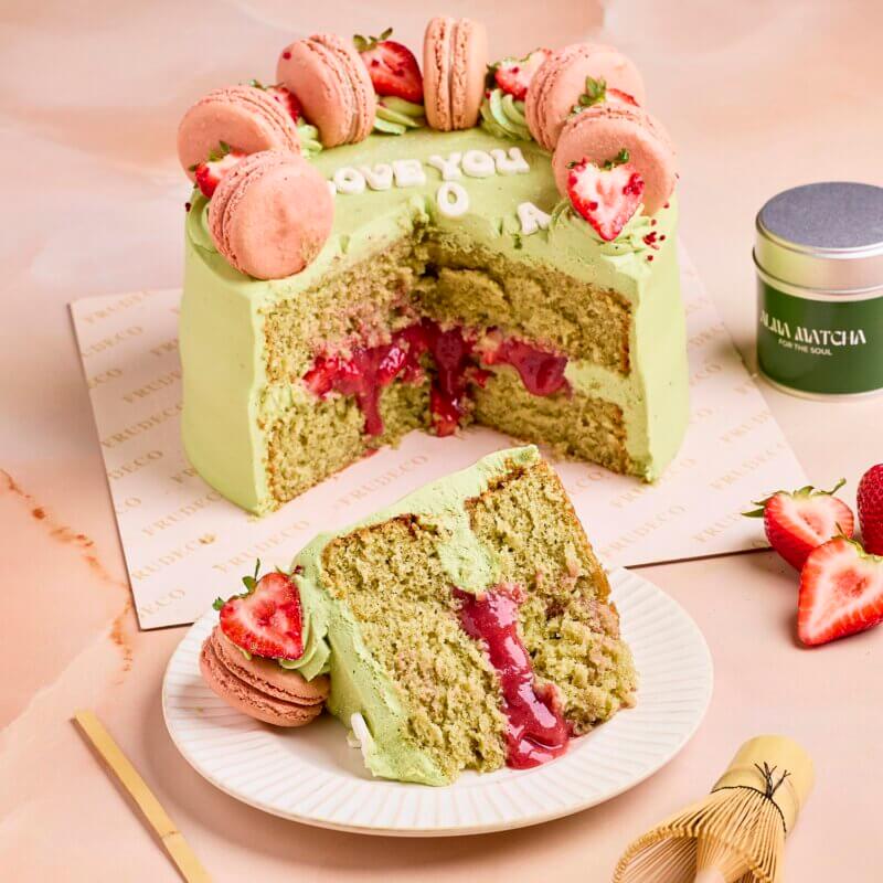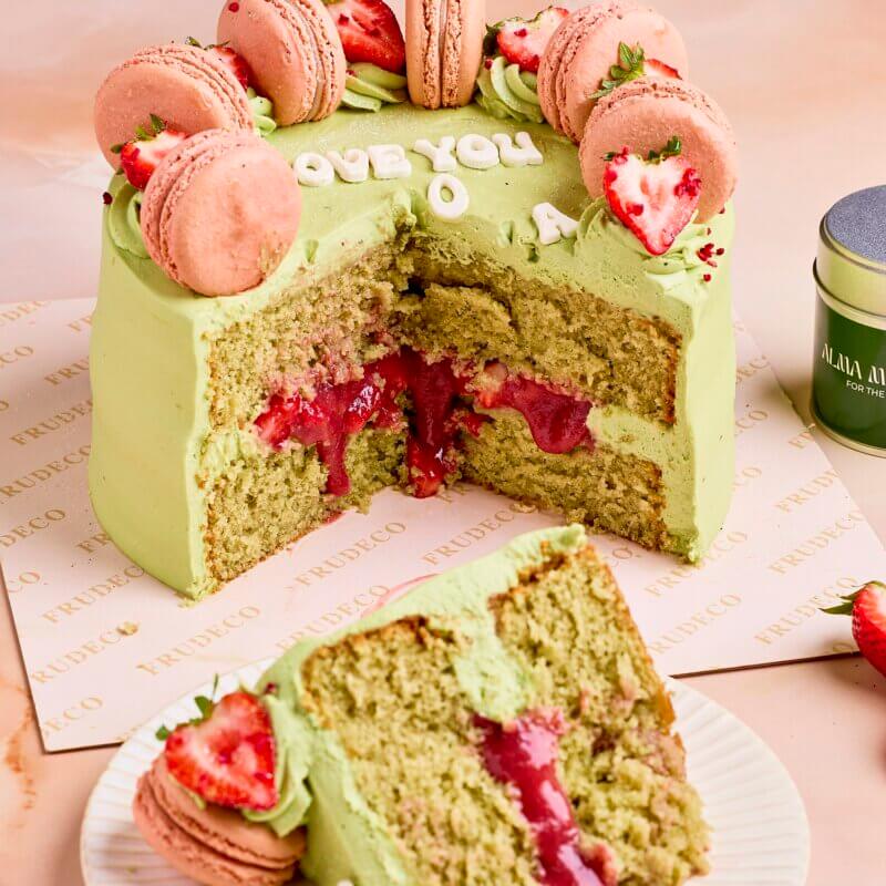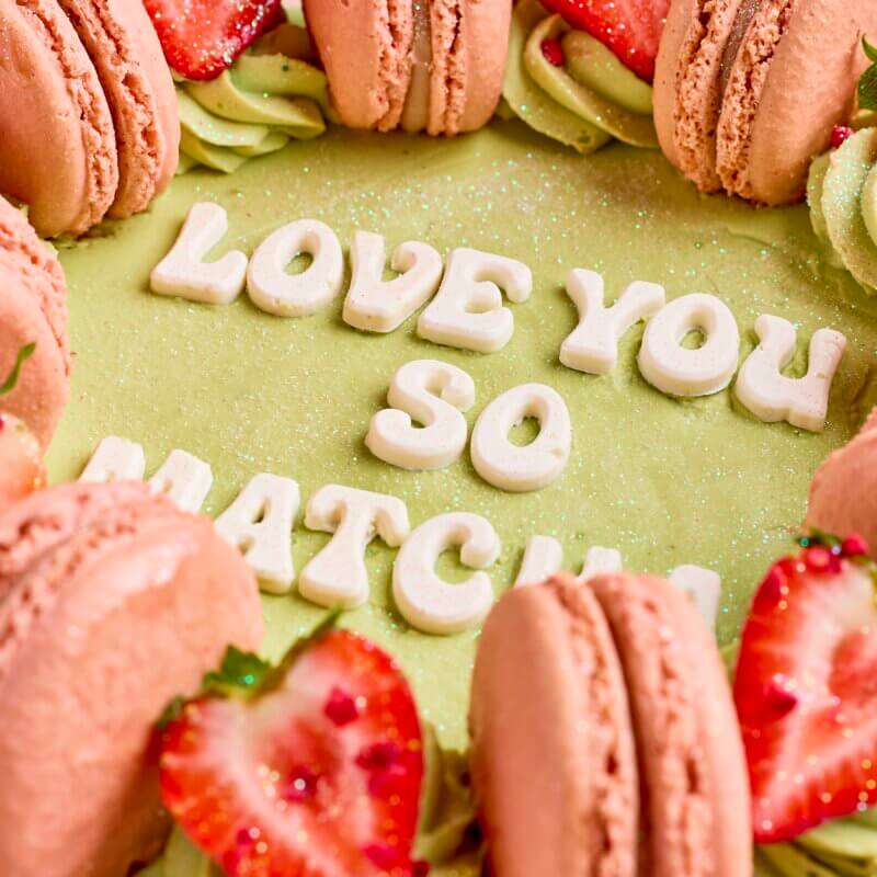 COVERED IN DELICIOUS MATCHA CREAM WITH STRAWBERRIES AND MACARONS