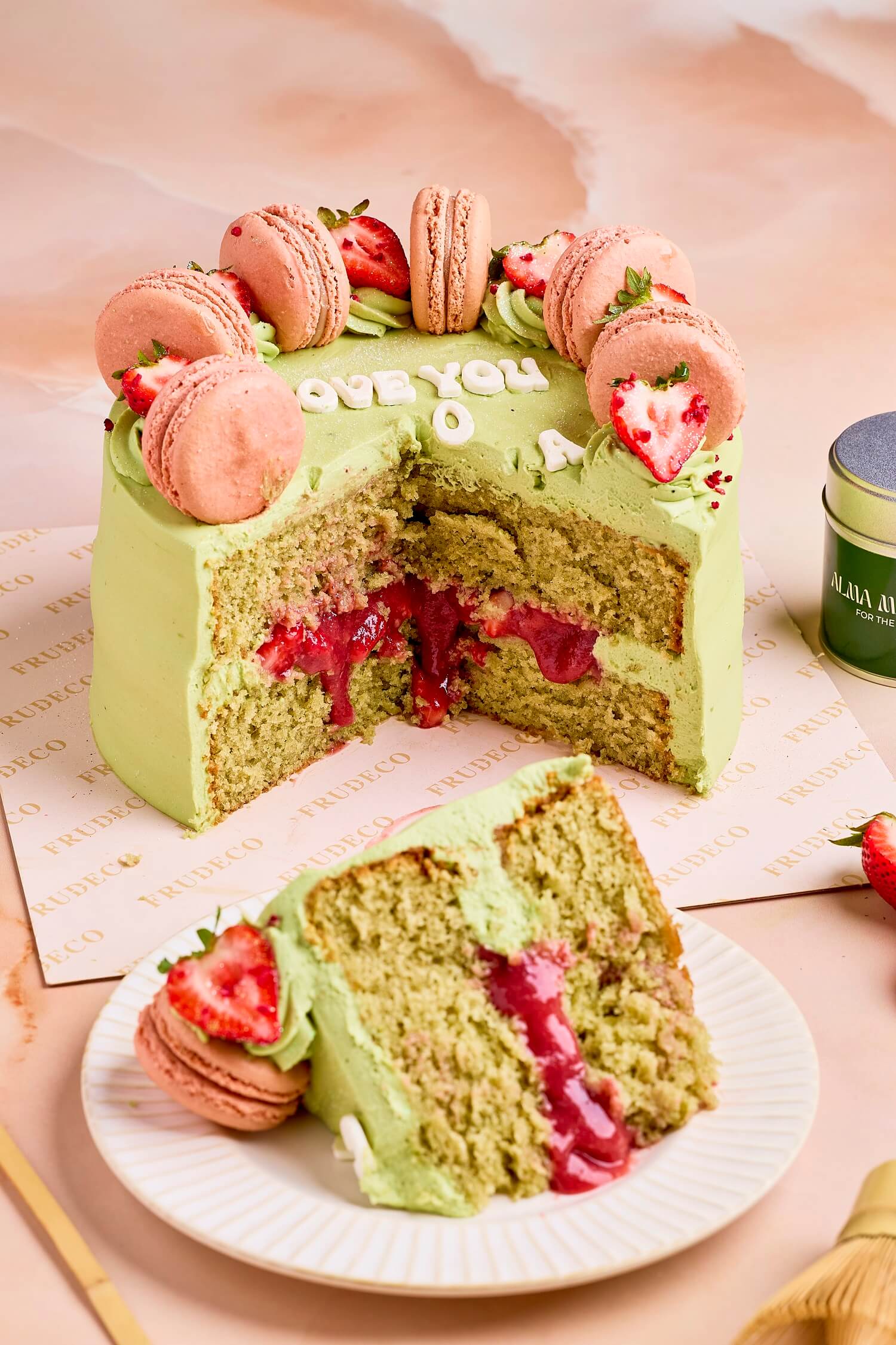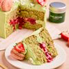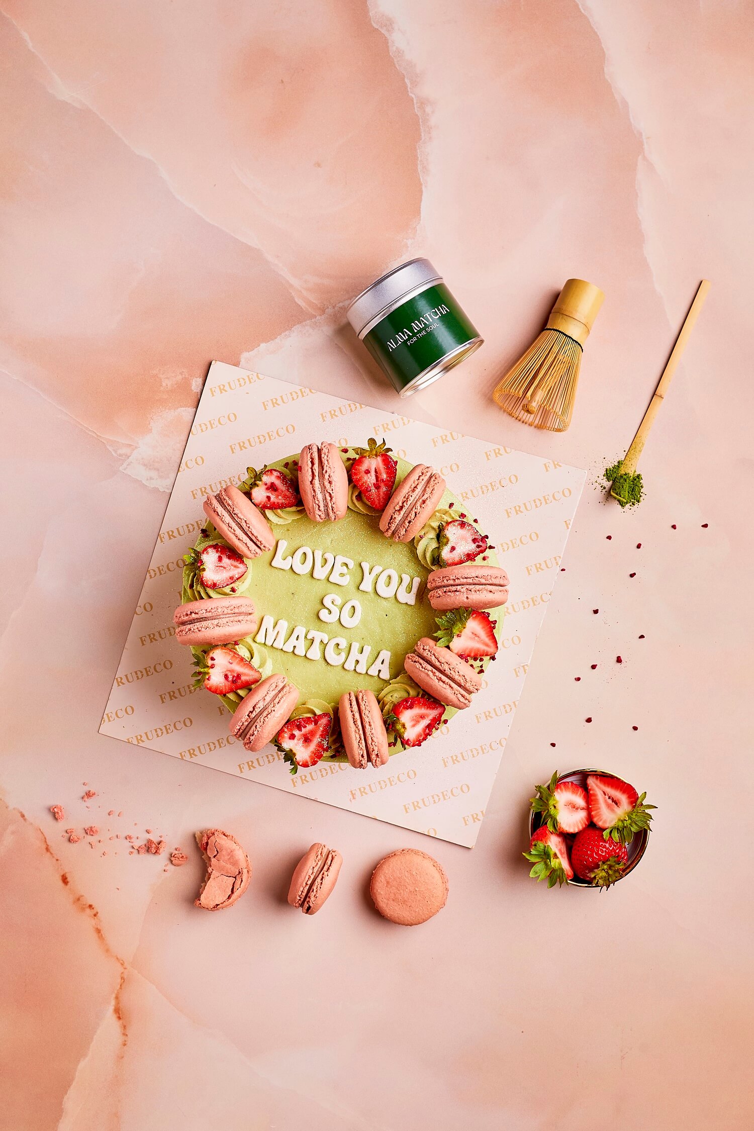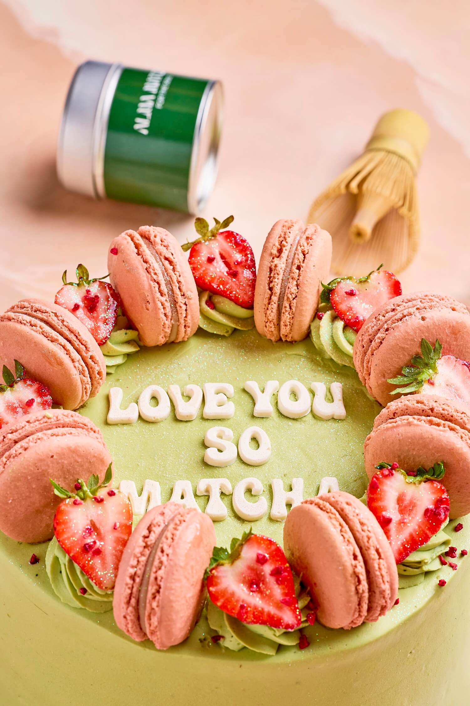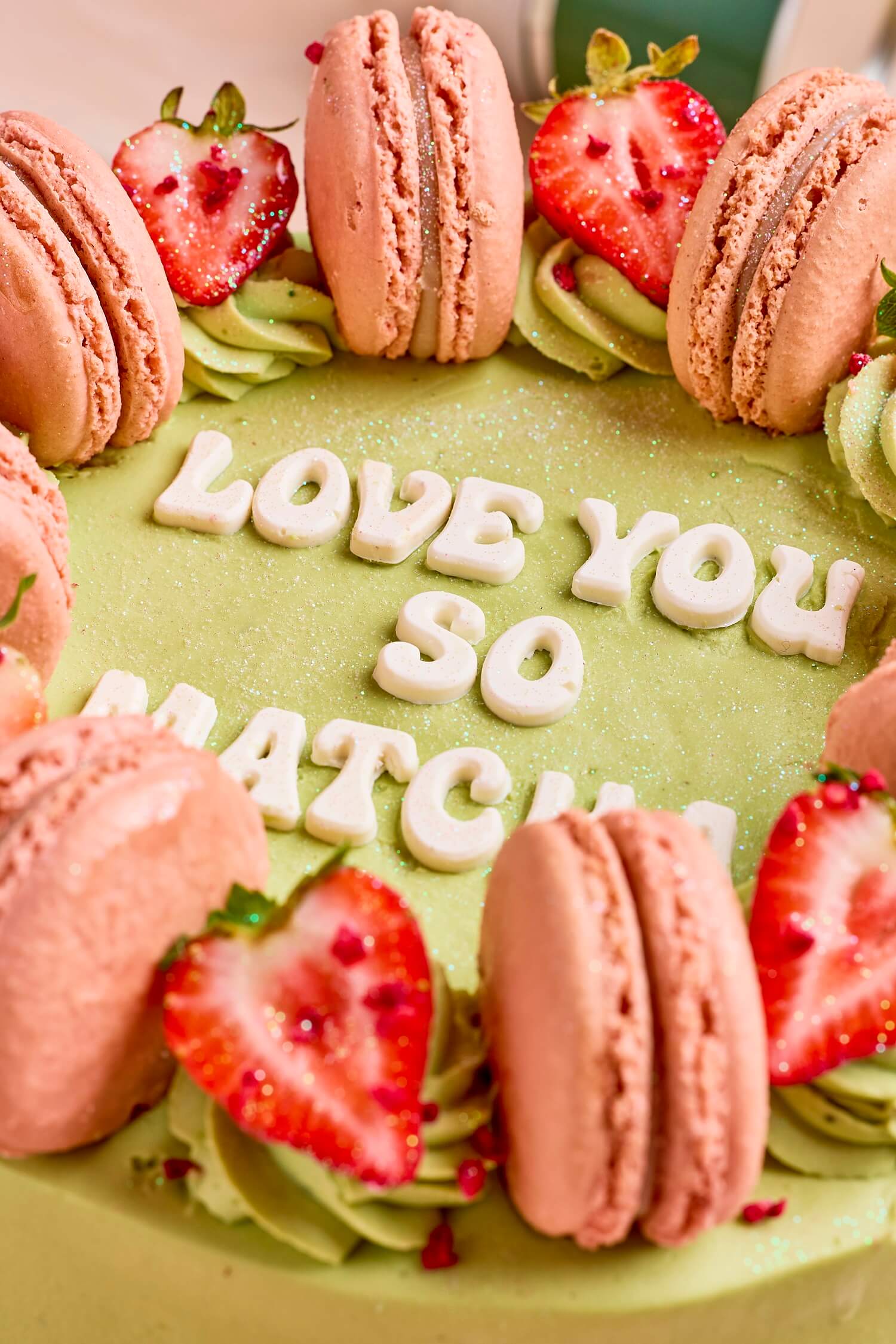 COVERED IN DELICIOUS MATCHA CREAM WITH STRAWBERRIES AND MACARONS