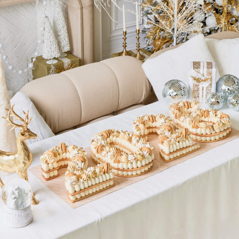 A traditional rectangular cake covered in smooth French vanilla cream becomes a beautiful centerpiece for celebrating the New Year. It is offered in three distinct decoration options: one adorned with fresh berries for a classic and vibrant look; another featuring an elegant black, gold, and silver theme for a bold and modern celebration; and a third designed in timeless white and gold for a refined and luxurious touch. Finished with delicate macarons and airy meringues, this cake perfectly represents elegance, joy, and sweet new beginnings.