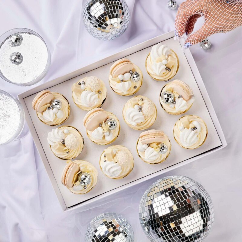 A delightful dozen of vintage-style cupcakes decorated with shimmering disco balls creates a playful yet elegant way to celebrate the end of the year. Each cupcake features delicate piping with nostalgic charm, while sparkling disco ball accents add movement and festive energy. Together, this set of twelve cupcakes captures the joy, glamour, and excitement of welcoming new beginnings and celebrating the arrival of the New Year in a fun and unforgettable style.