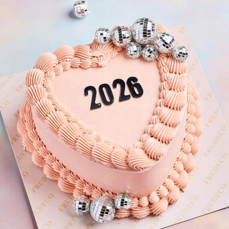 A romantic vintage heart-shaped cake becomes a dazzling centerpiece to celebrate the end of the year. Adorned with delicate piping, shimmering disco balls, and elegant letter-style numbers forming 2026, it blends nostalgic charm with festive sparkle. This cake symbolizes love, celebration, and new beginnings, making it the perfect sweet statement to say goodbye to the year and welcome the New Year with style and joy.
